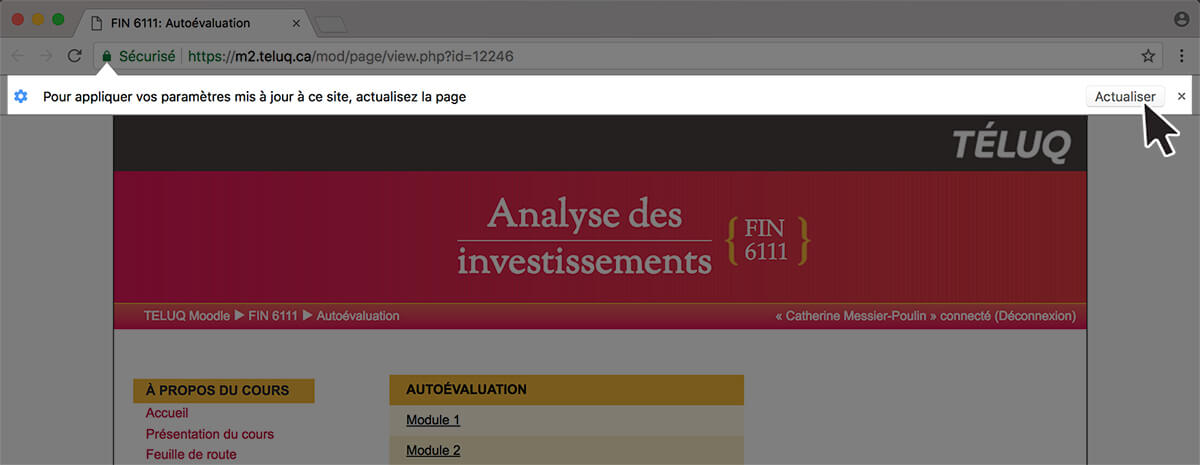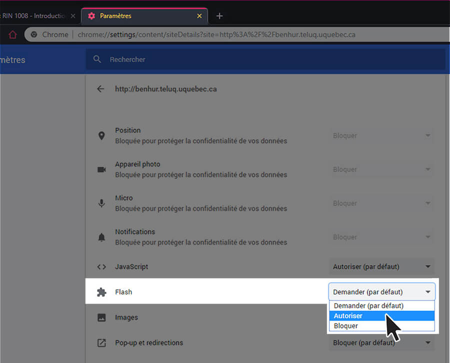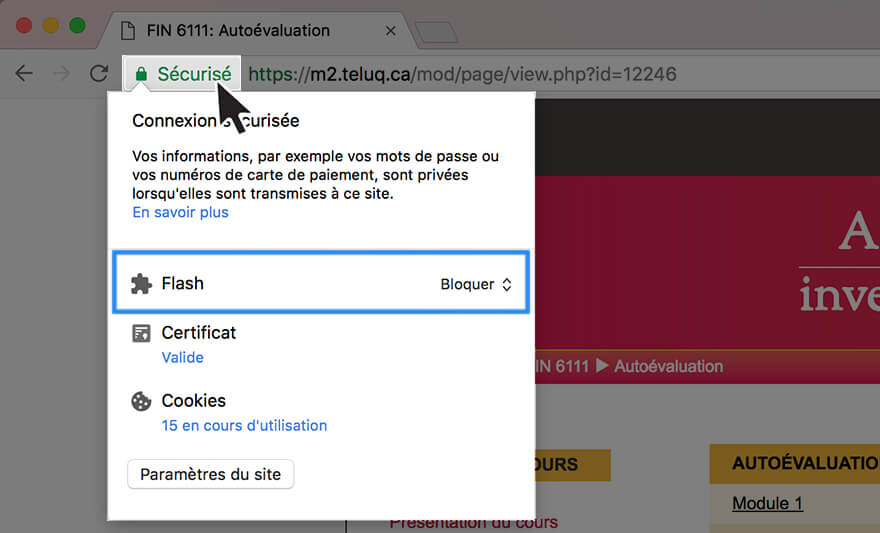 Par exemple, voici la procédure à suivre pour autoriser l’exécution de « Flash » avec le navigateur Chrome (vous trouverez une liste des autres navigateurs à la fin de cette page).